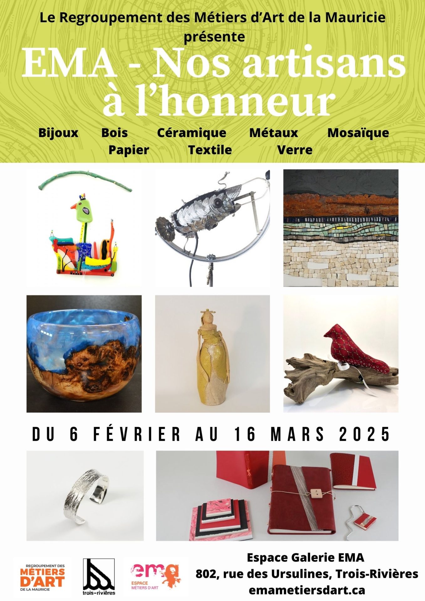 EMA – NOS ARTISANS À L’HONNEUR est une exposition collective qui regroupe les productions de 25 artisans, dans la famille des bijoux, bois, céramiques, métaux, mosaïque, papier, textile et verre. Venez voir leurs œuvres inédites, des œuvres qui ont gagné des prix et certaines œuvres de leur collection privée.