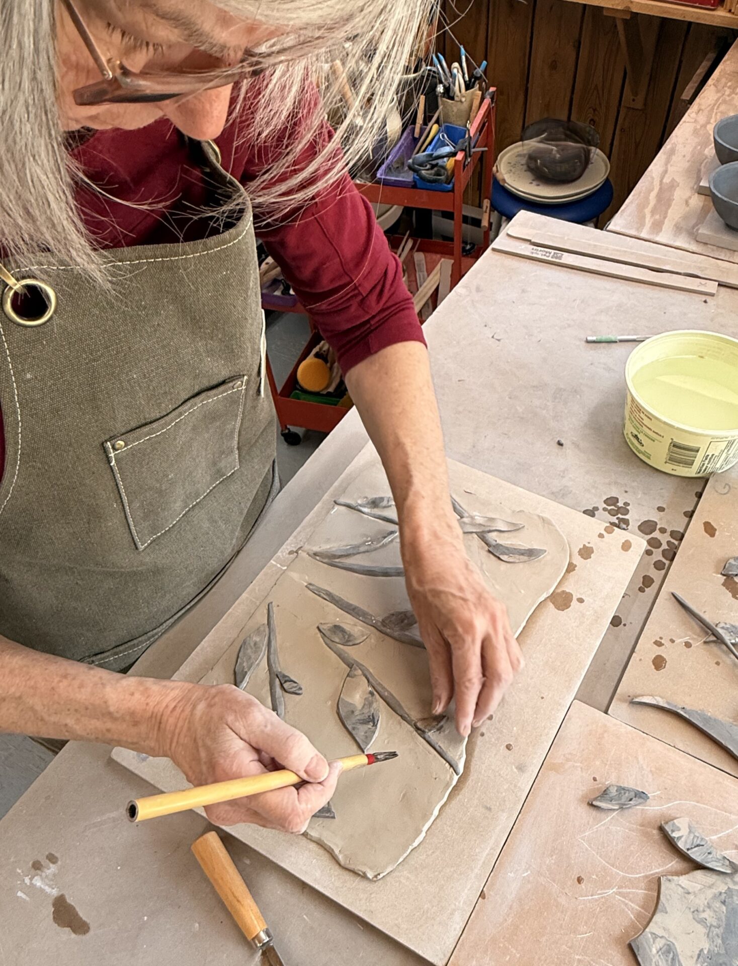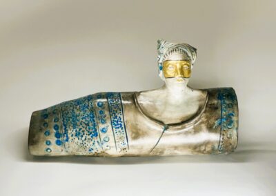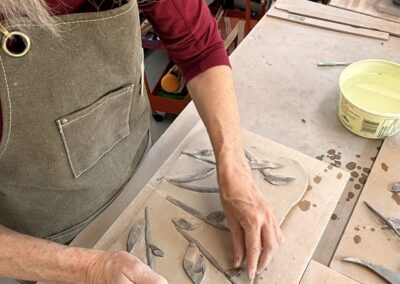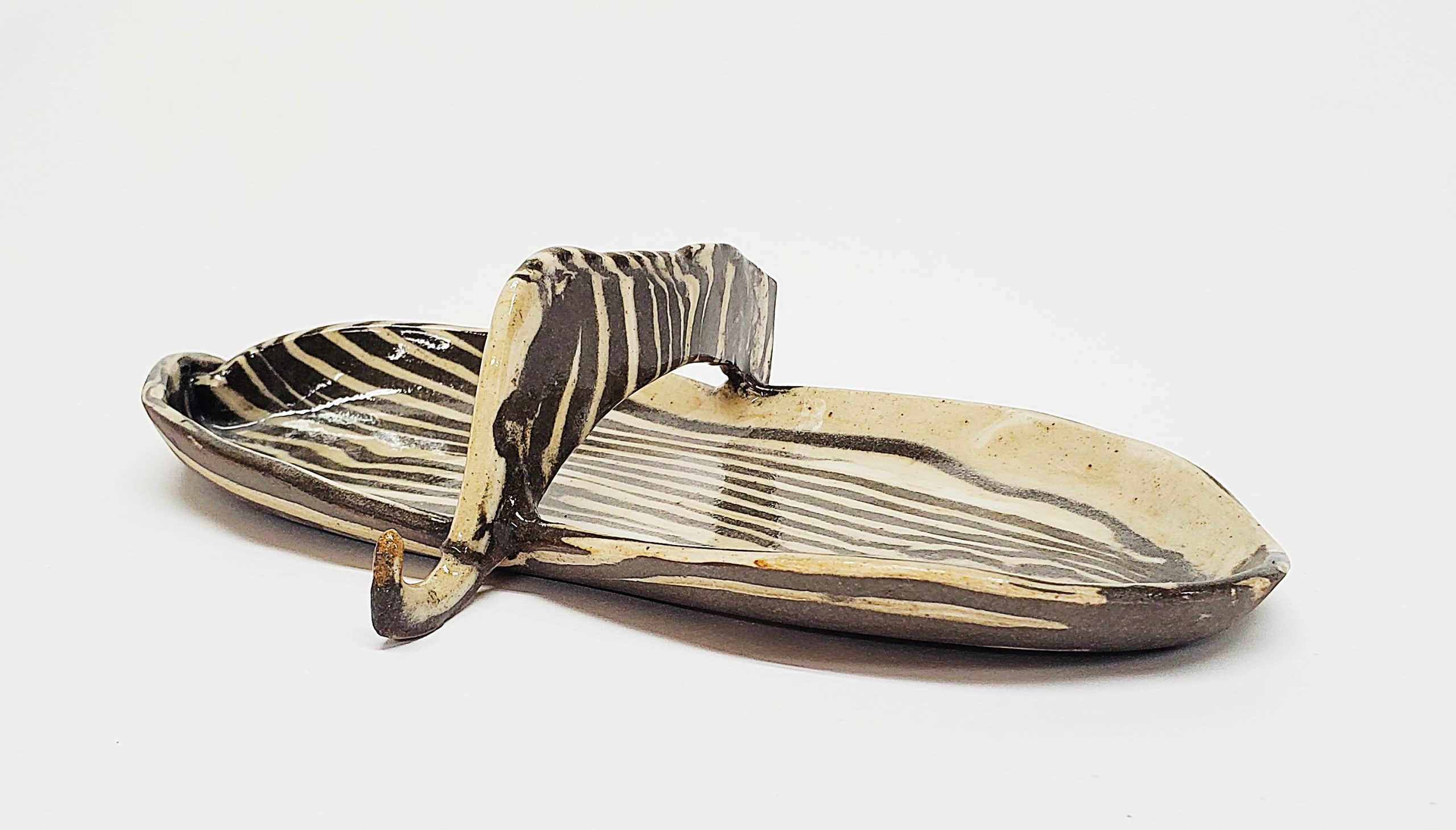 Danielle Tremblay a une formation en arts visuels et en céramique. Elle a choisi ce métier d’art parce que cette discipline regroupe le dessin, la peinture, la sculpture, le décor, tout ça dans un seul domaine, la céramique. Elle travaille le grès et la porcelaine. Pour quelques pièces, avant la cuisson, elle colore la pâte céramique dans la masse et assemble les morceaux colorés selon la technique nerikomi. Elle produit des pièces au tour mais plus souvent, elle les confectionne à la main par assemblage et façonnage. Vases, boîtes, assiettes, sculptures, chaque pièce est unique, cuite au four céramique et certaines ont aussi une cuisson primitive par enfumage. L’atelier est situé dans un environnement forestier où elle s’inspire de la nature de feuillage et de fougères qui l’entourent.
